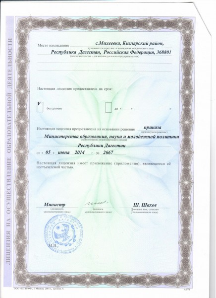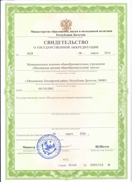 | Адрес местонахождения образовательной организации* | 368801, РД Кизлярский район с.Михеевское, ул.Комарова 1 |